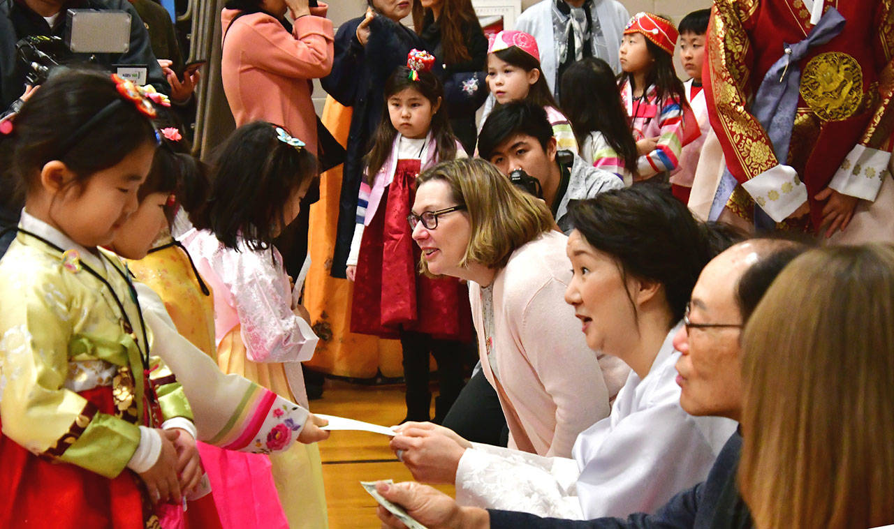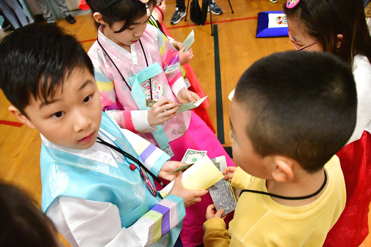 Students bowed to their elders in brightly colored traditional dress and received good luck envelopes during the event.