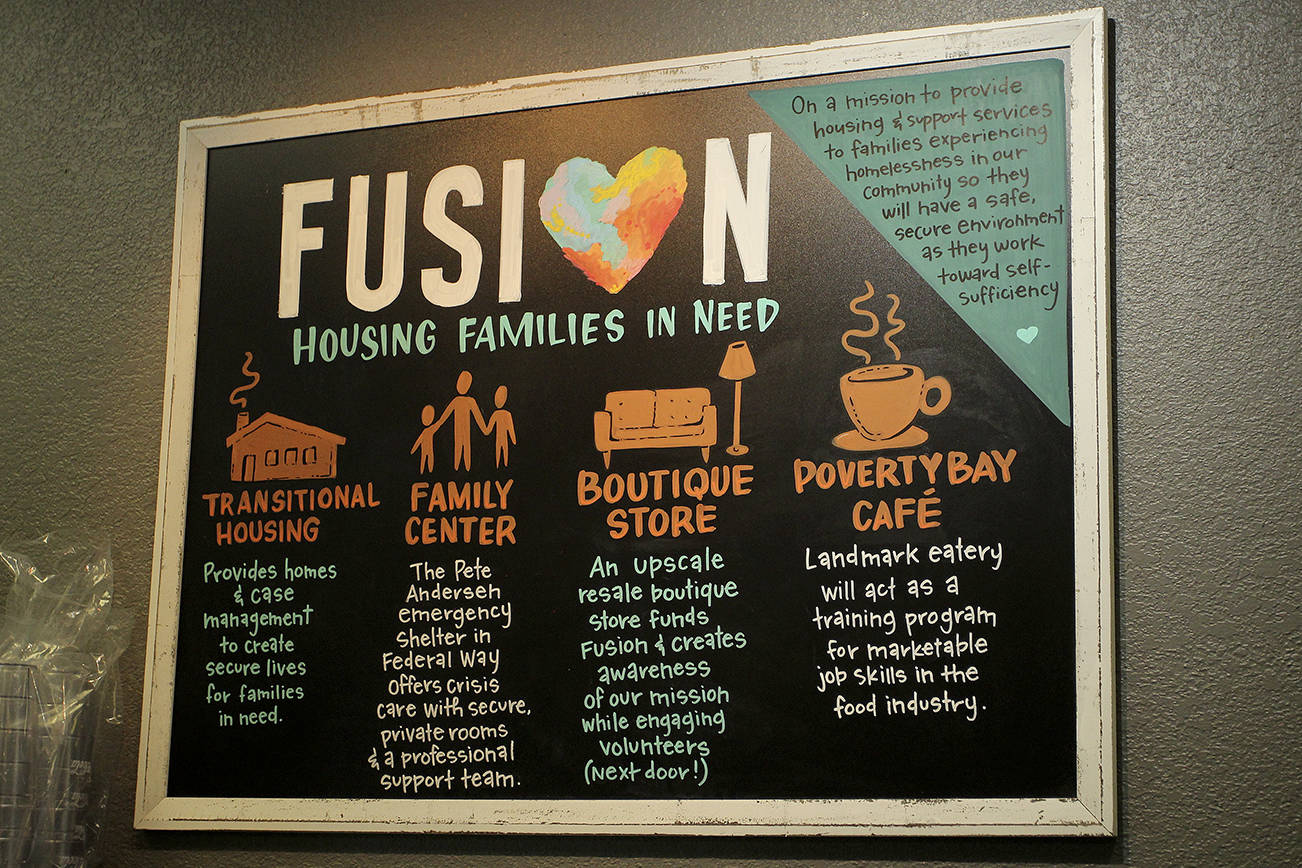 The nonprofit provides over 20 transitional housing homes for families in need and operates an upscale resale furniture boutique, along with Federal Way’s first shelter for unhoused families. The cafe is FUSION’s first venture into the restaurant industry.