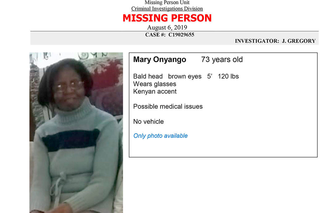 Mary Onyango, 73, went missing from her sister’s Shoreline Home on Aug. 2. When Onyango answered a call on her cell phone, she said she believed her location was in Federal Way.