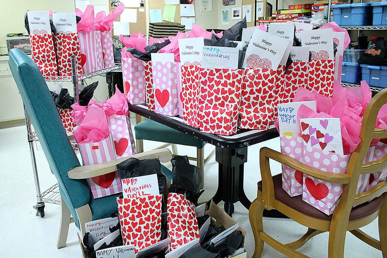 A mountain of red and pink bags sat on a table in the Hallmark Manor activity office, spilling onto nearby chairs and carts. The goodie bags were donated by Do the Right Thing non-profit, started by Cheryl Hurst.