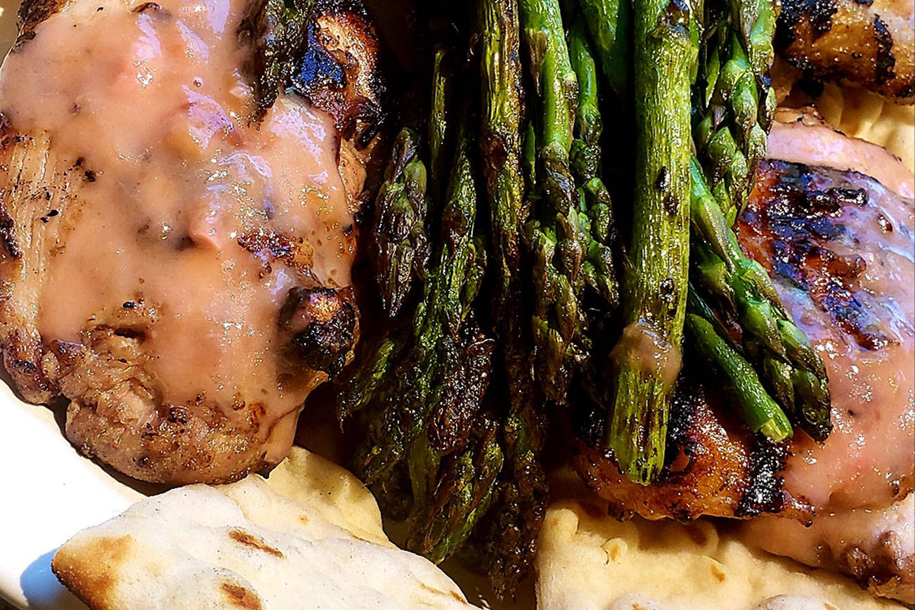 Serve with grilled asparagus; before cooking, clean and trim Bautista Farms asparagus, pat dry and place in a plastic bag with ¼ cup Ancient Trees Extra Virgin Olive Oil.
