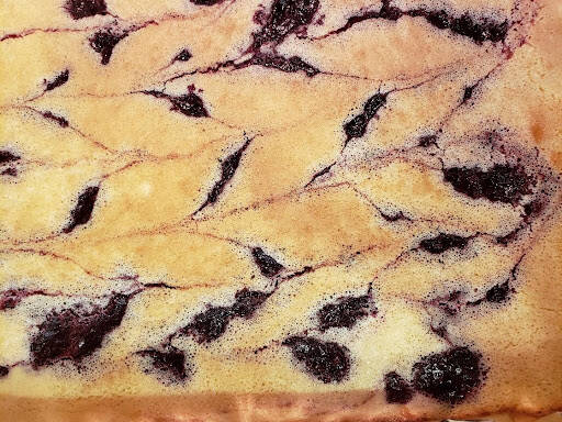 5. Pour filling onto baked crust. Pour blackberry sauce in five parallel lines across width of pan, using 1 tbsp for each line. Using the tip of a knife, gently pull through blackberry lines from side to side in alternating directions.