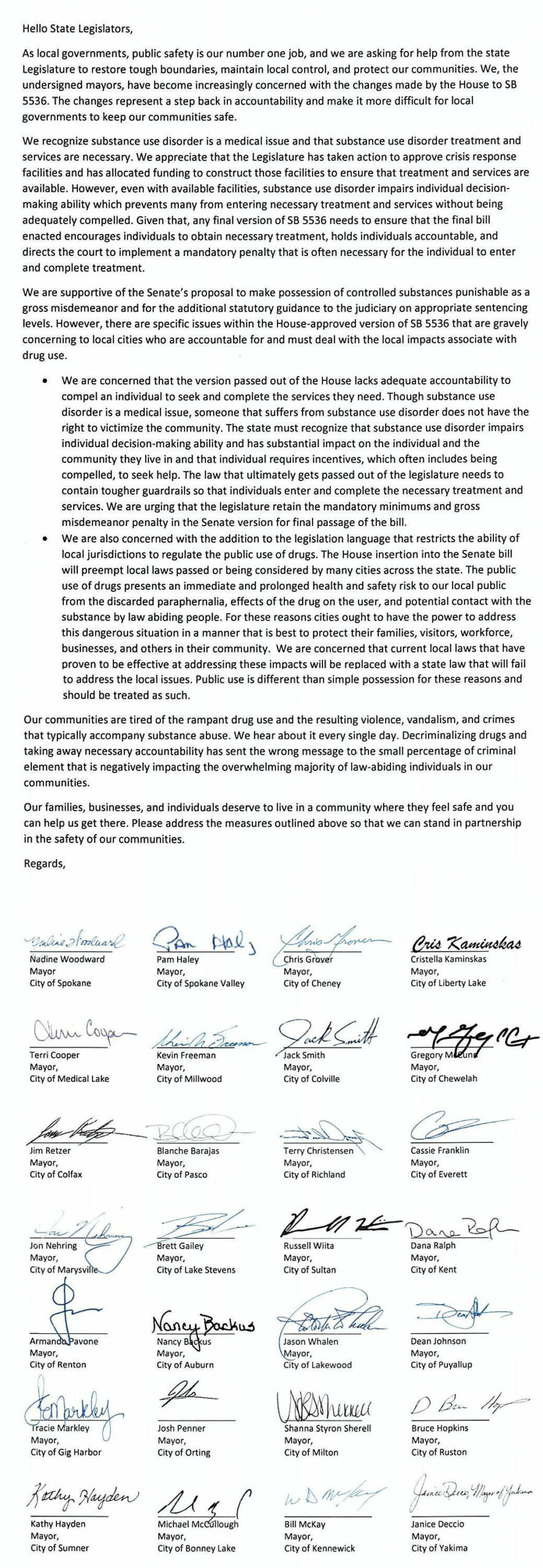 “As local governments, public safety is our number one job, and we are asking for help from the state Legislature to restore tough boundaries, maintain local control and protect our communities,” the letter begins. “We, the undersigned mayors, have become increasingly concerned with the changes made by the House to Senate Bill 5536. The changes represent a step back in accountability and make it more difficult for local communities to keep our communities safe.”