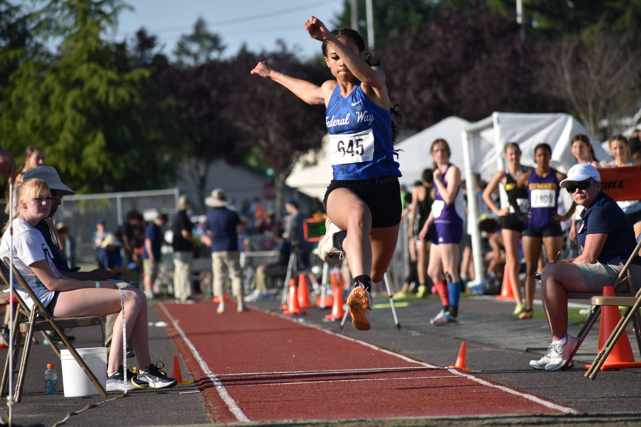 Roman Hutchinson and Cassandra Atkins both won the long and triple jump for boys and girls. In the boys triple jump, Federal Way swept the first three positions. Hutchinson came in first, followed by Jaylon Jenkins and then Julien Gene Fortin. “It feels good to come out and compete with my brothers. We’ve been jumping since freshman year together,” Gene Fortin said.