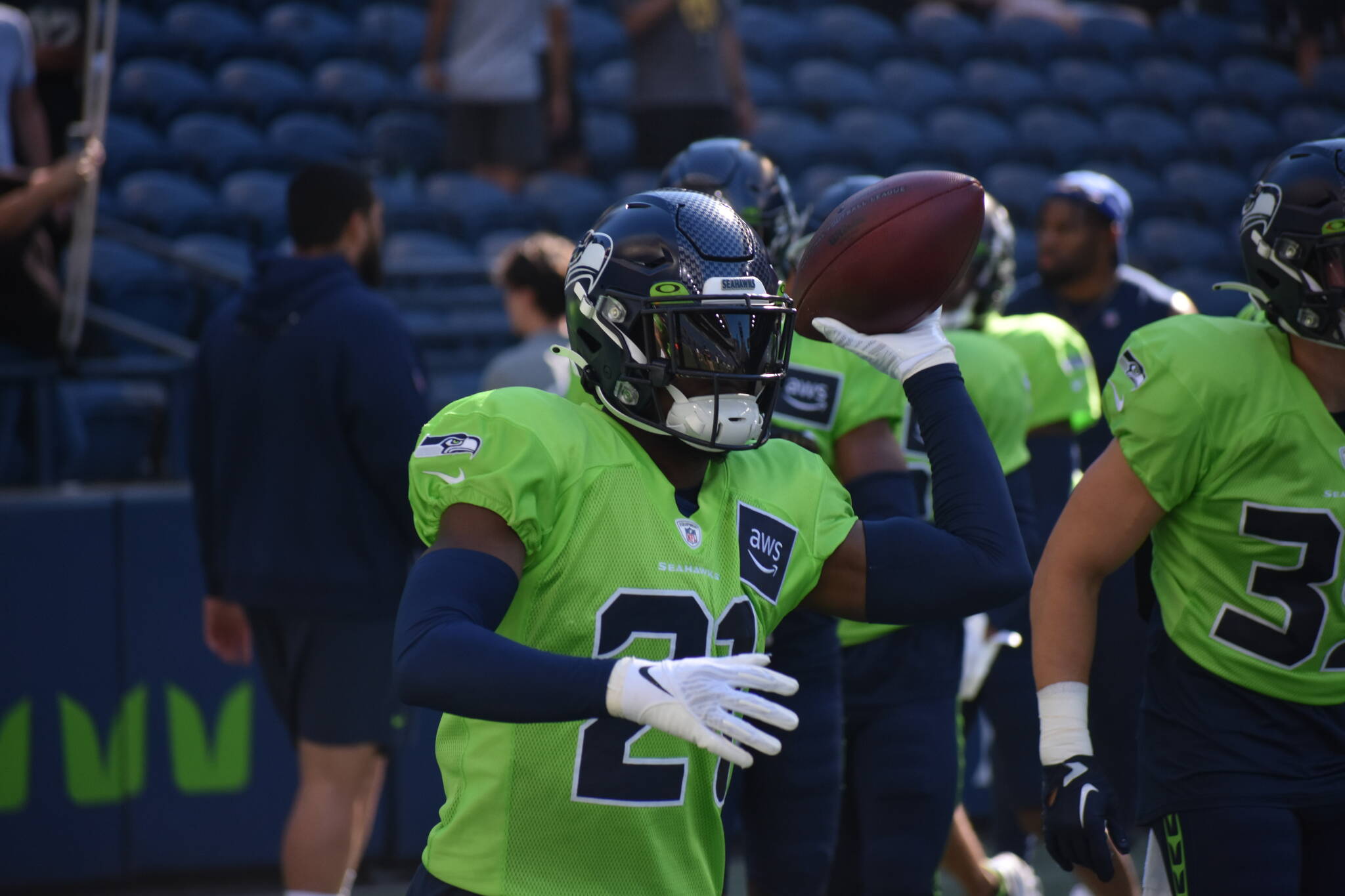 Seahawks first-round pick Devon Witherspoon throws a football to a coach during warm-ups. (Photos by Ben Ray / Sound Publishing)