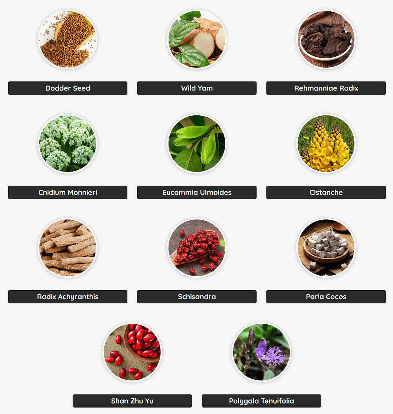 So, what’s inside each capsule? It’s a blend of plants that nature gave us, carefully chosen to work like magic for your mojo. We’re talking Dodder Seed, Wild Yam, Rehmanniae Radix, Cnidium Monnieri, Eucommia Ulmoides, Cistanche, Radix Achyranthis, Schisandra, Poria Cocos, Shan Zhu Yu, and Polygala Tenuifolia.